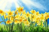 Piękne kwitnące żółte żonkile na zewnątrz w słoneczny dzień