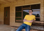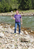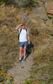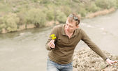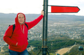 szczęśliwy człowiek daje podwójne v-sign na szczycie wzgórza