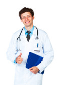 młody mężczyzna uśmiechający się lekarz wyświetlone schowka z kopia miejsce na