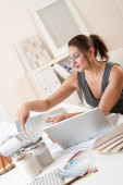 młody projektant kobieta na telefon w biurze z laptopa i kolor próbki