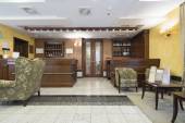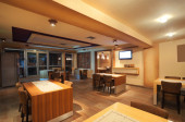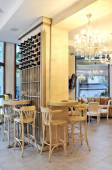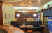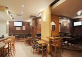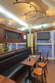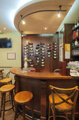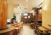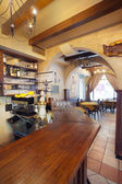 wnętrze małej kawiarni, widok na drewnianym barze.