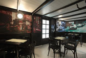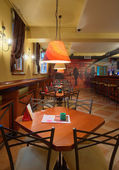 wnętrze małej kawiarni, starym stylu stylu mieszany z wyposażeniem nowoczesnych mediów.