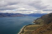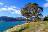 Jezioro Hawea w regionie Otago, Wyspa Południowa, Nowa Zelandia. Leży w dolinie otoczonej górami.