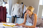 Fashion designer working at studio with dressmakers model and sketches