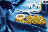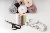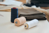 studio projektant mody z profesjonalnego sprzętu na biurku, tkaniny, nożyczki