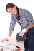 Poprawczak: uśmiechnięta kobieta może farba i szczotki