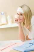 Przeprowadzka, w domu: kobieta wypakowaniu pudełko z naczynia kuchenne, garnki i patelnie