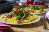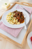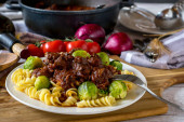 domowej roboty gulasz wołowy z makaronem, warzywami i polewą śmietankową serwowane na talerzu. Widok z bliska z rozmytym tłem tabeli
