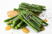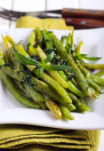 Widok na Zenith. Szparagi z krewetkami, odrobina przypraw i oliwy z oliwek, białe tło.