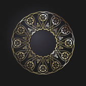 Zdjęcie "Dekoracyjne ażurowe okrągłe ramki ze złotym abstrakcyjnym wzorem na czarnym tle. Okrągły ornament. Elegancki element designu. Wektor." może być wykorzystywane do celów osobistych i komercyjnych zgodnie z warunkami zakupionej licencji Royalty-free. Obraz jest dostępny do pobrania w jakości wysokiej rozdzielczości do 5760x3840.