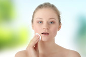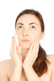 Pielęgnacja ciała: młoda kobieta z jar balsam w łazience, na białym tle