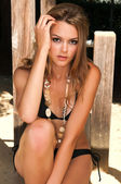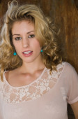 piękna Młoda blondynka w łóżku w tan bluzki z dzianiny