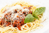 spaghetti pikantne z bekonem, pietruszką i serem parmezanowym Świeży pieprz, liść bazylii. Makaron Carbonara na białym talerzu. Włoska koncepcja żywności.