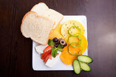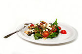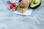 świeże pomidory czerwone i żółte, plasterki awokado, liście bazylii i sos winegret malinowy na kwadrat biały talerz i kawałek artisan chleba