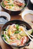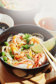 Azjatycki obiad dla dwojga. Kuchnia azjatycka, makaron z owocami morza i warzywami
