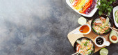 romantyczna kolacja dla dwojga. Kuchnia azjatycka, makaron ryżowy z krewetkami i owocami morza, zielony groszek i cebula. Sos sojowy i różne świeże warzywa. romantyczna kolacja w czarnych talerzach z japońskimi pałeczkami