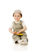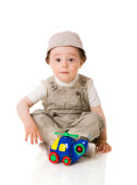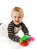rok chłopiec bawi się zabawkami kolorowy na białym tle