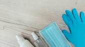 żel dezynfekujący do czyszczenia dłoni i gumowe rękawice medyczne na tle