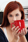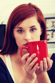 młody i zmysłowy blond picia filiżankę kawy rano i patrząc w aparacie