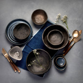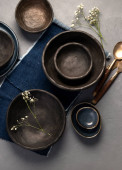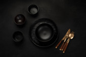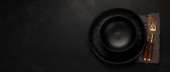 Table setting with a black plates on a black background. Minimalism concept.