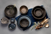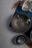 Zdjęcie "Table setting with a black plates on a black background. Minimalism concept. " może być wykorzystywane do celów osobistych i komercyjnych zgodnie z warunkami zakupionej licencji Royalty-free. Obraz jest dostępny do pobrania w jakości wysokiej rozdzielczości do 5760x3840.