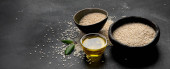 Czarne i białe nasiona sezamu na czarnym tle. Koncepcja żywności ekologicznej Widok z góry, Kopiuj przestrzeń, panorama, baner
