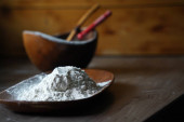 Wheat flour on dark background. Food preparing concept.