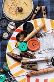 Tło naczyń kuchennych na białym drewnianym stole kuchennym. narzędzia. Widok z góry