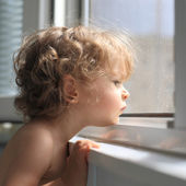 Słodki blond maluch, chłopiec, chowający się za zasłoną w domu, uśmiechający się szczęśliwie