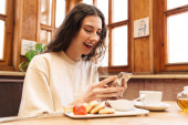 Zdjęcie "Happy ruda dziewczyna macha ręką i za pomocą telefonu komórkowego podczas siedzenia w kawiarni wewnątrz" może być wykorzystywane do celów osobistych i komercyjnych zgodnie z warunkami zakupionej licencji Royalty-free. Obraz jest dostępny do pobrania w jakości wysokiej rozdzielczości do 5760x3840.