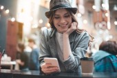 Happy ruda dziewczyna macha ręką i za pomocą telefonu komórkowego podczas siedzenia w kawiarni wewnątrz