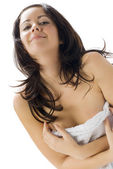 blond i ładny dziewczyna gra z niebieski arkuszy na jej łóżku i co twarz