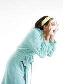 blond i ładny dziewczyna gra z niebieski arkuszy na jej łóżku i co twarz