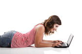 ładna i młoda kobieta Azji, patrząc na laptopie z wyrażenie zabawny