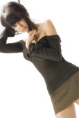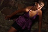 słodkie azjatyckie modelka na sobie fioletowy koszuli przed mur z cegły