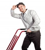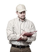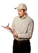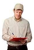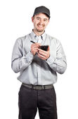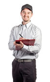 dostawa kaukaski młody człowiek w pracy na białym tle