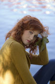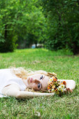 zewnątrz portret blond dziewczyna śpi na gałęzi drzewa w parku