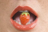 otwarte usta czerwona szminka z truskawka między zęby