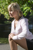ładny blond dziewczyna pracuje w parku, w pobliżu rzeki