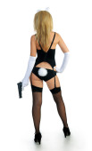 piękne sexy blond dziewczyna w czarnej sukni, zdejmując kapelusz biały