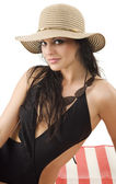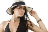 ładny portret młody piękny blond czarny top i biały kapelusz