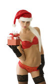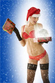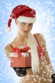 piękny seksowny blond Mikołaj siedzi na podłodze patrząc wewnątrz jej prezent worek