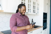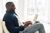 Zdjęcie "Radosny i pozytywny Afroamerykanin przewijający się na ekranie dotykowym tabletu cyfrowego" może być wykorzystywane do celów osobistych i komercyjnych zgodnie z warunkami zakupionej licencji Royalty-free. Obraz jest dostępny do pobrania w jakości wysokiej rozdzielczości do 5760x3840.