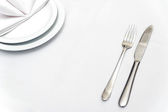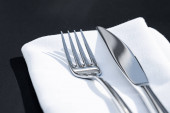 Stylowe błyszczące sztućce na białym stole, zbliżenie