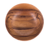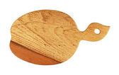 Zamknij jeden duży okrągły kształt brązowy używany dąb drewna kuchnia deska do krojenia z ciemnymi plamami oparzeń i cięcia nożem ślady izolowane na białym tle