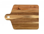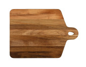 Blisko jeden prostokątny kształt ciemnobrązowy dąb drewna kuchnia deska do krojenia z ciemnymi plamami oparzeń i nóż cięcia ślady izolowane na białym tle