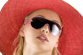 elegant blond young woman wearing blue polka dot dress and a nice blue hat