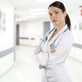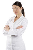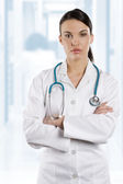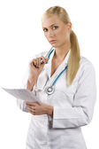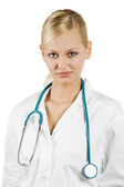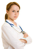 uśmiechający się lekarz z stetoskop na białym tle nad białym