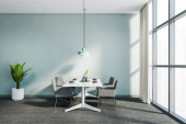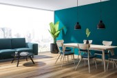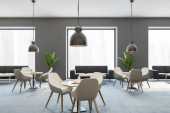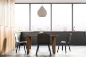 Wnętrze jadalni w miejscu publicznym, okrągłe drewniane stoły i sofa w rzędzie na parkiecie, widok z boku, minimalistyczny design restauracji. Okna z widokiem na miasto na drapacze chmur, renderowanie 3D bez ludzi
