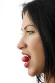 atrakcyjna młoda kobieta w akcie jeść czerwona wiśnia